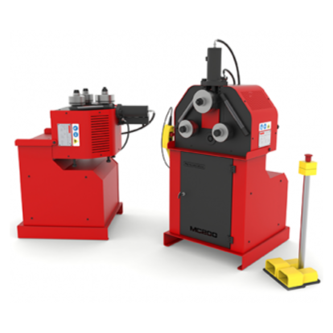 Curvadoras Hidráulicas de Tubos y Perfiles MC200H NARGESA fabricadas en acero, arrastre a los dos rodillos, transmisión por piñones, ejes templados y rectificados. Capacidad máxima de curvado en tubo redondo: 2" 1/2 pulgadas o 70 mm