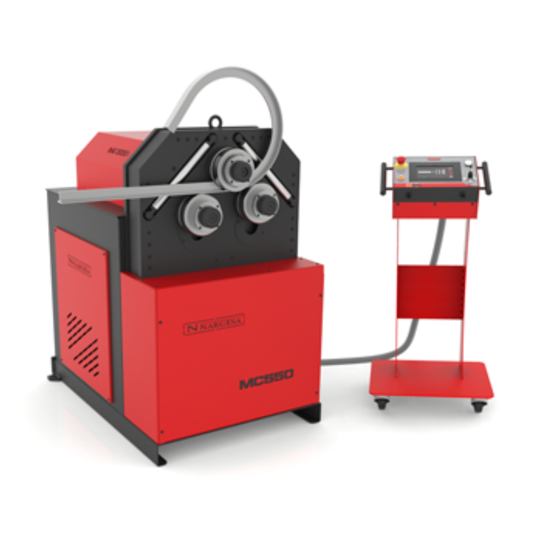 La NUEVA Dobladora de tubos Curvadora de perfiles MC550 Nargesa se ha diseñado y fabricado íntegramente en nuestra fábrica. Ha sido concebida para realizar producciones de piezas en serie mediante su Panel de Control, que registra la posición de los rodillos en cada curva y repite las mismas operaciones posteriormente. Sin el control de posicionamiento longitudinal. Capacidad máxima de curvado en tubo redondo: 3” pulgadas (76,2 mm) o 80 mm