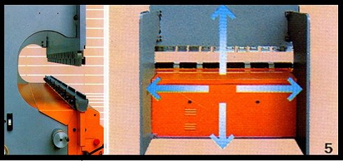 Diseño estructural de la máquina con gran longitud de paso entre montantes y amplio cuello de cisne aprovecha el máximo espacio útil para permitir plegados de gran profundidad y/o desarrollo. GUIADOS DE PRECISION en sentido longitudinal y transversal asegura un alineamiento perfecto.