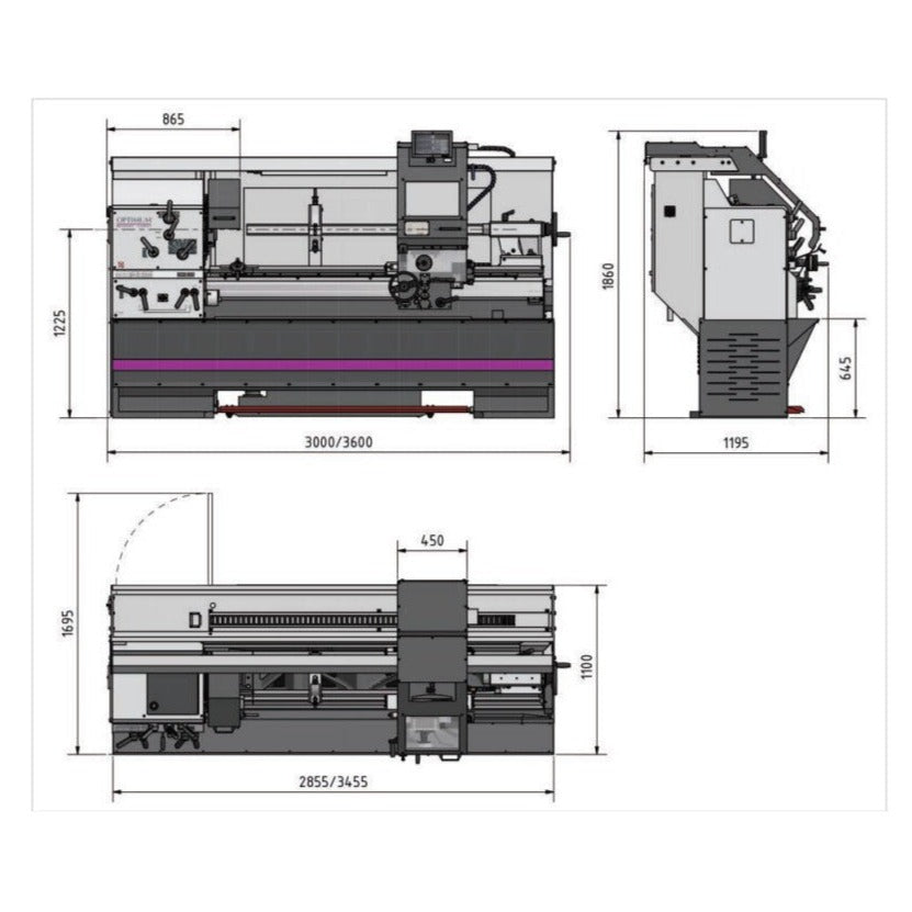 Plato de 3 garras de Ø 315 mm camlock no. 8, casquillo de reducción MT 7 / MT 5, contrapunto fijo MT 5 largo, contrapunto fijo MT 5 corto, herramientas de funcionamiento, carga inicial con aceite de alta calidad.